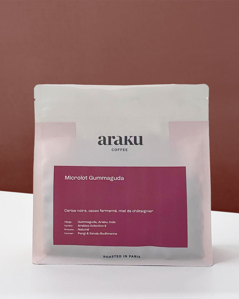 Ce café bio, limité en quantité, est entièrement récolté à la main entre novembre et janvier dans les parcelles du village de Gummaguda sur les hauteurs de la vallée d'Araku en Inde. Le Microlot Gummaguda se distingue par des saveurs intenses de cerise noire, de cacao fermenté et de miel de châtaignier. Il a bénéficié d’un traitement naturel lui offrant une complexité et un équilibre digne des meilleurs cafés en grains.
